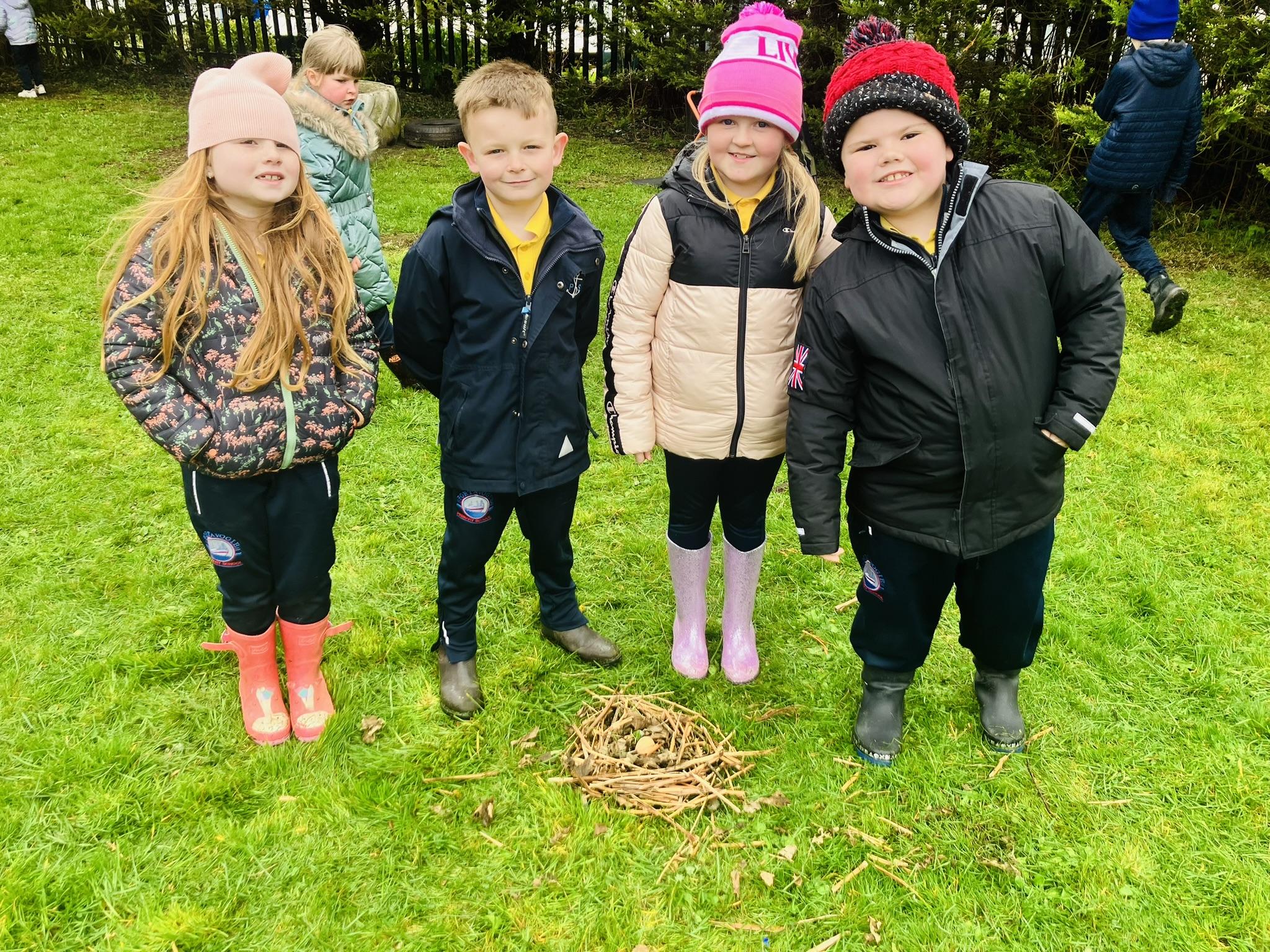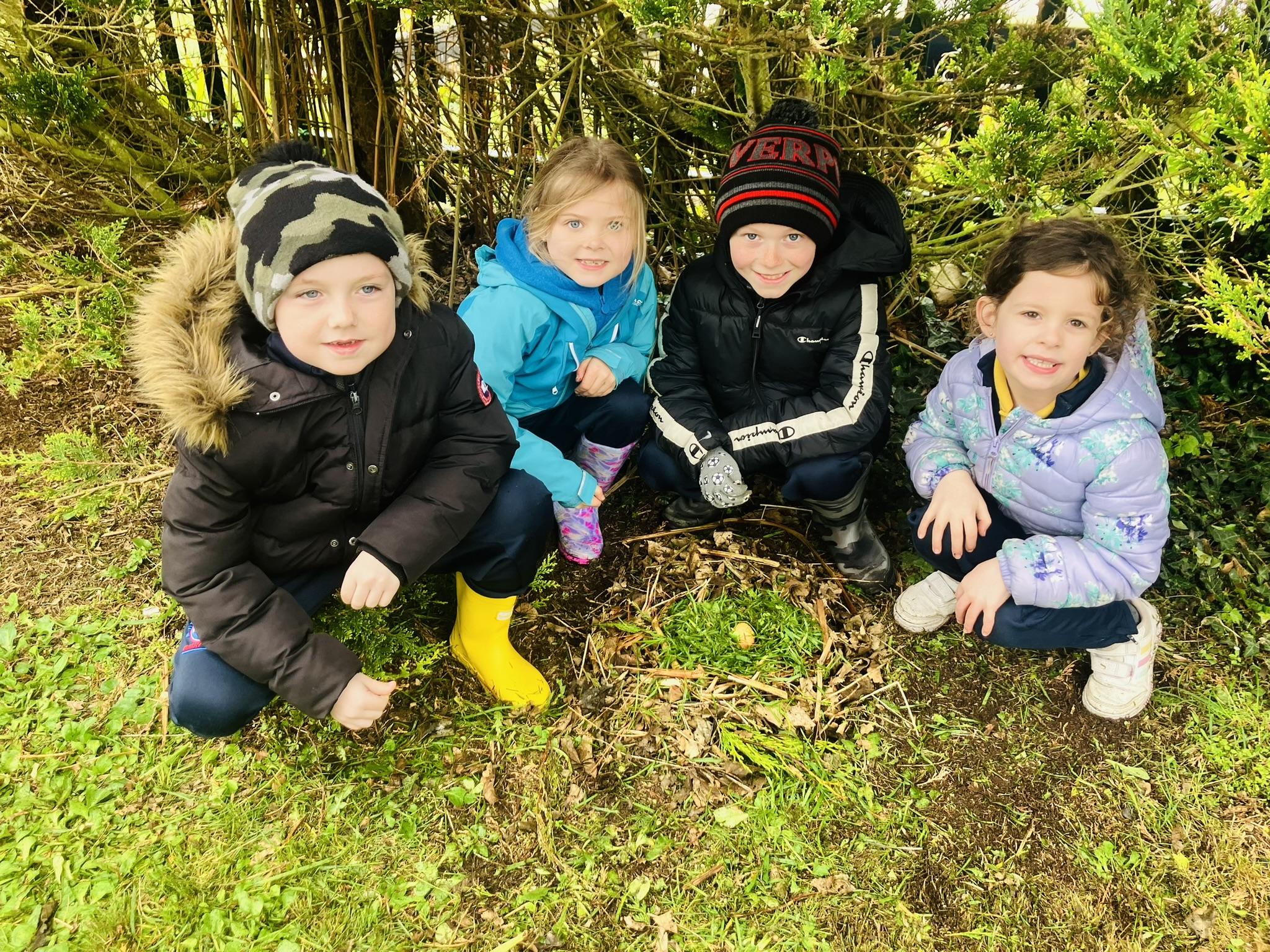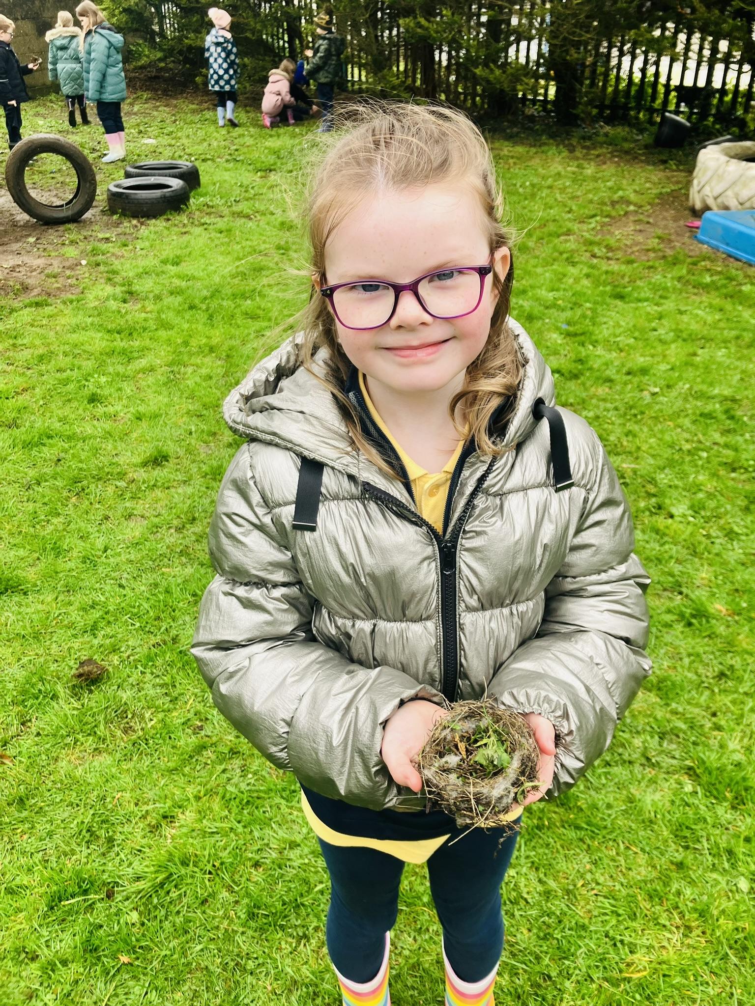 P3 enjoyed learning about bird nests. We investigated what they are made from and what is inside them. We split into groups and each group was given an egg. The groups were challenged to create a nest for their egg. We worked together in our groups to find twigs, grass and leaves to build our nests. We were lucky enough to discover a REAL nest as well! Have a look below at the fun we had in our session.
